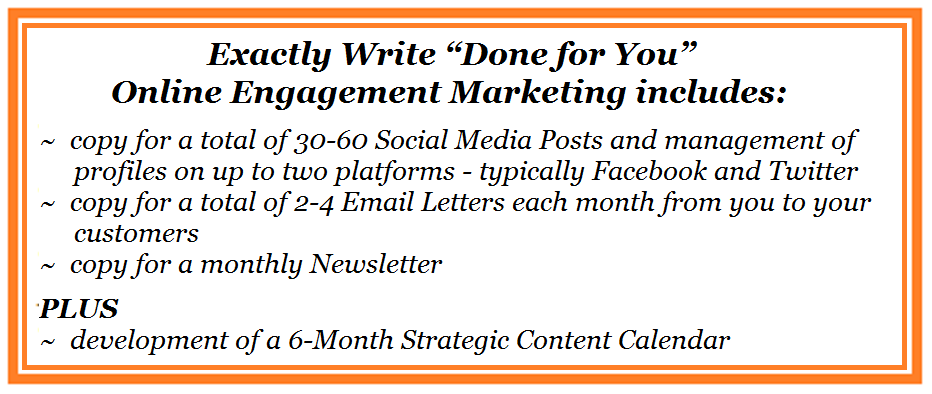 AND, for a limited time right now, you get two 6-Month Strategic Content Calendars FREE as part of the 12-Month “Done for You” Package Plan to implement the full Exactly Write Online Customer Engagement System!